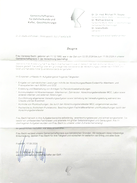 Assistance for dental medical treatments and Medical Documentation using Charly Solutio. Created temporaries, x-rays and imprints. Advised patients in prophylaxis. Administration, organisation of treatments and quality management.
