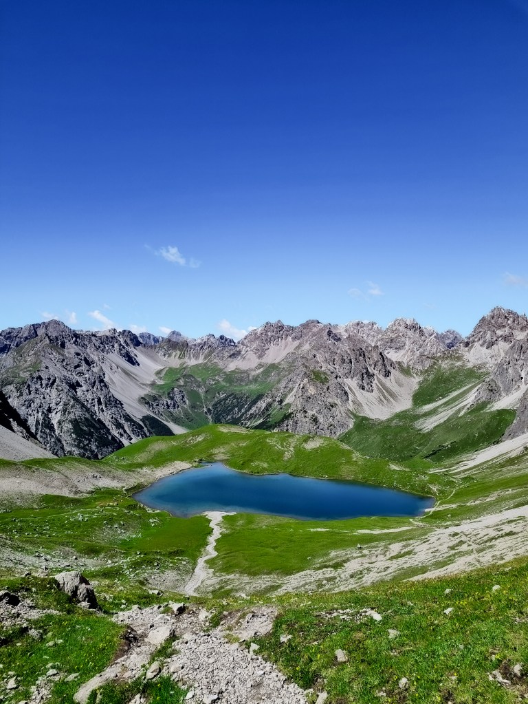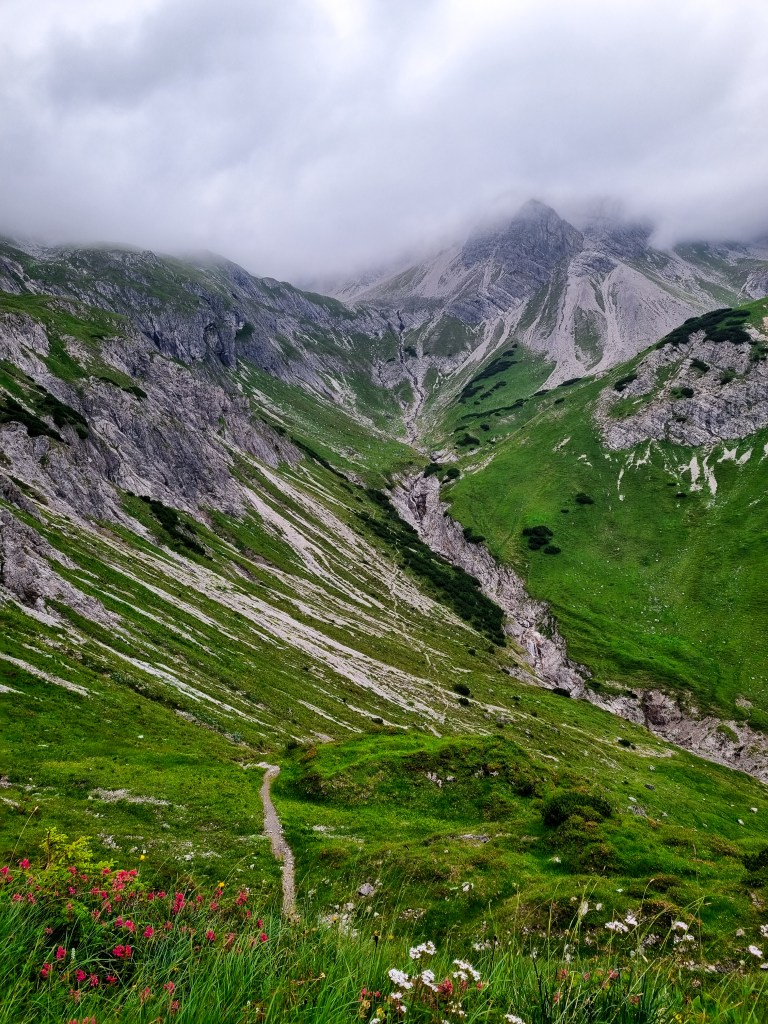 The next day I had nice views at Mädelejoch, the mountains of Tirol were visible. I hiked to upper and lower Rossgumpenalpe, through Höhlenbachtal and down further to Holzgau. By taxi I arrived in Boden, hiked along Bschlabsertal to Hanauer Hütte with backpack transport to the hut.