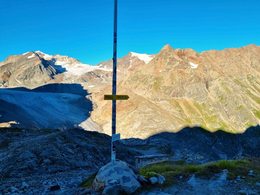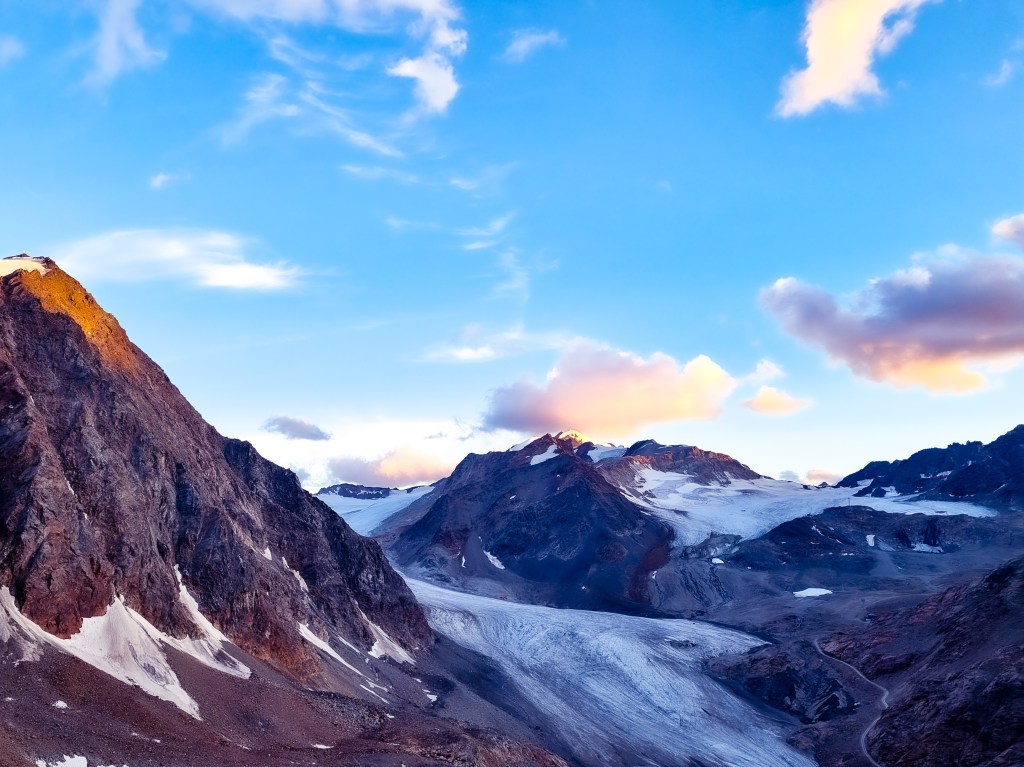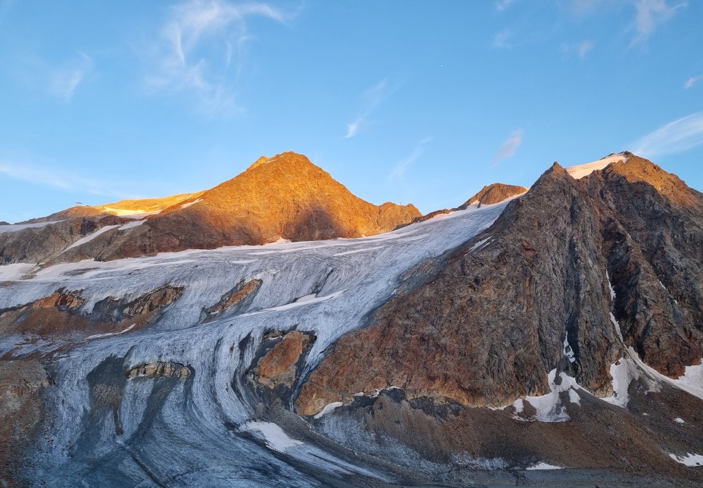 In 2022, the golden light of the sunrise crossed the mountain peaks. The glacier tongue of the Mittelbergferner, located on the mountain called Mittelberg.