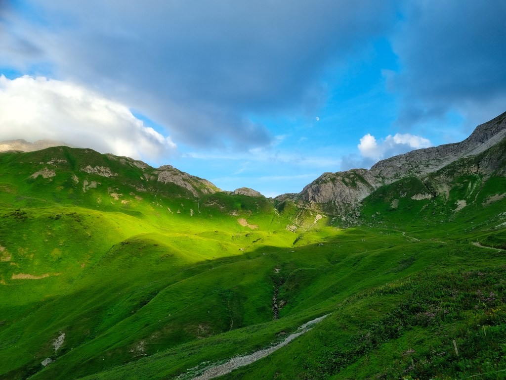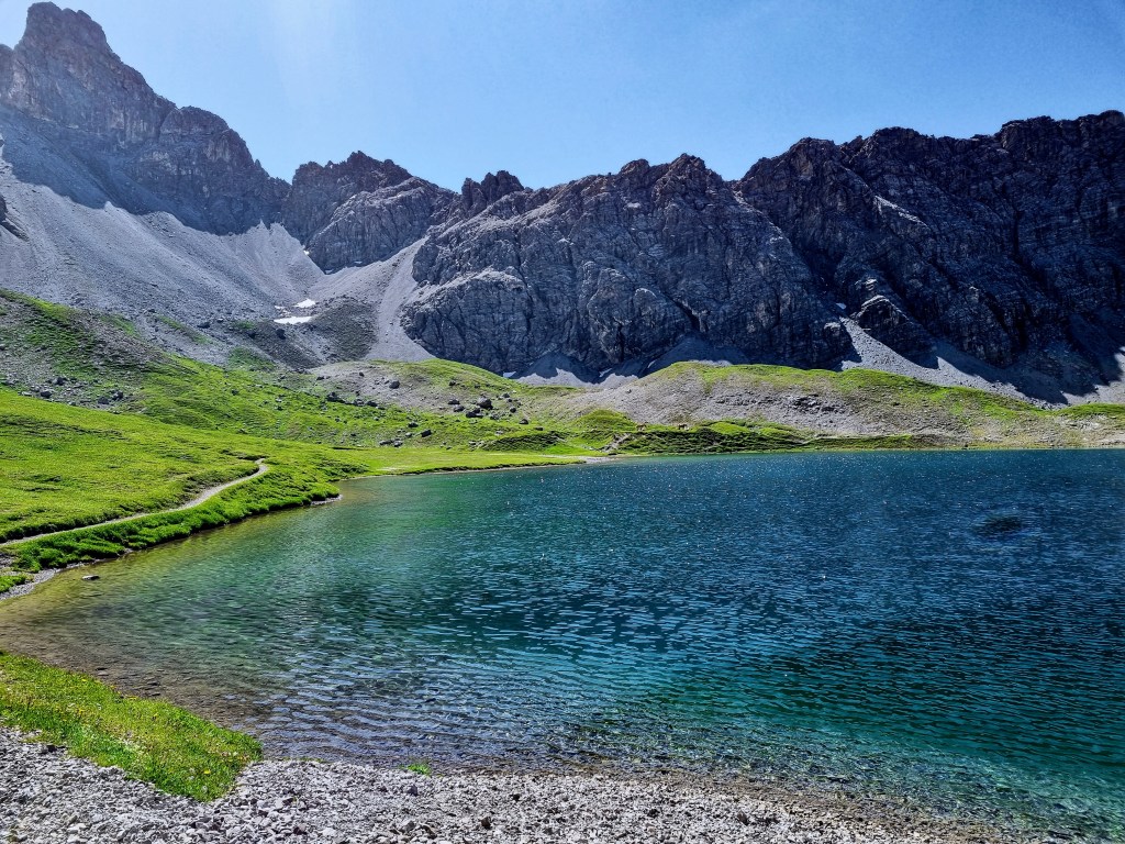 In 2022, I captured this amazing lake surrounded by mountains and grass. The sun was shining in the middle of the day, warming my body from the cold of the shades.