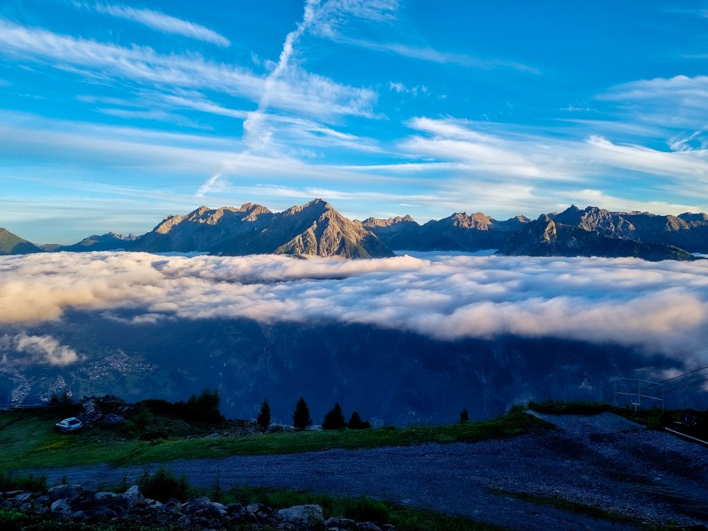 In 2022, a wide thin cloud hides the mountain view from the Venet Panoramarestaurant.